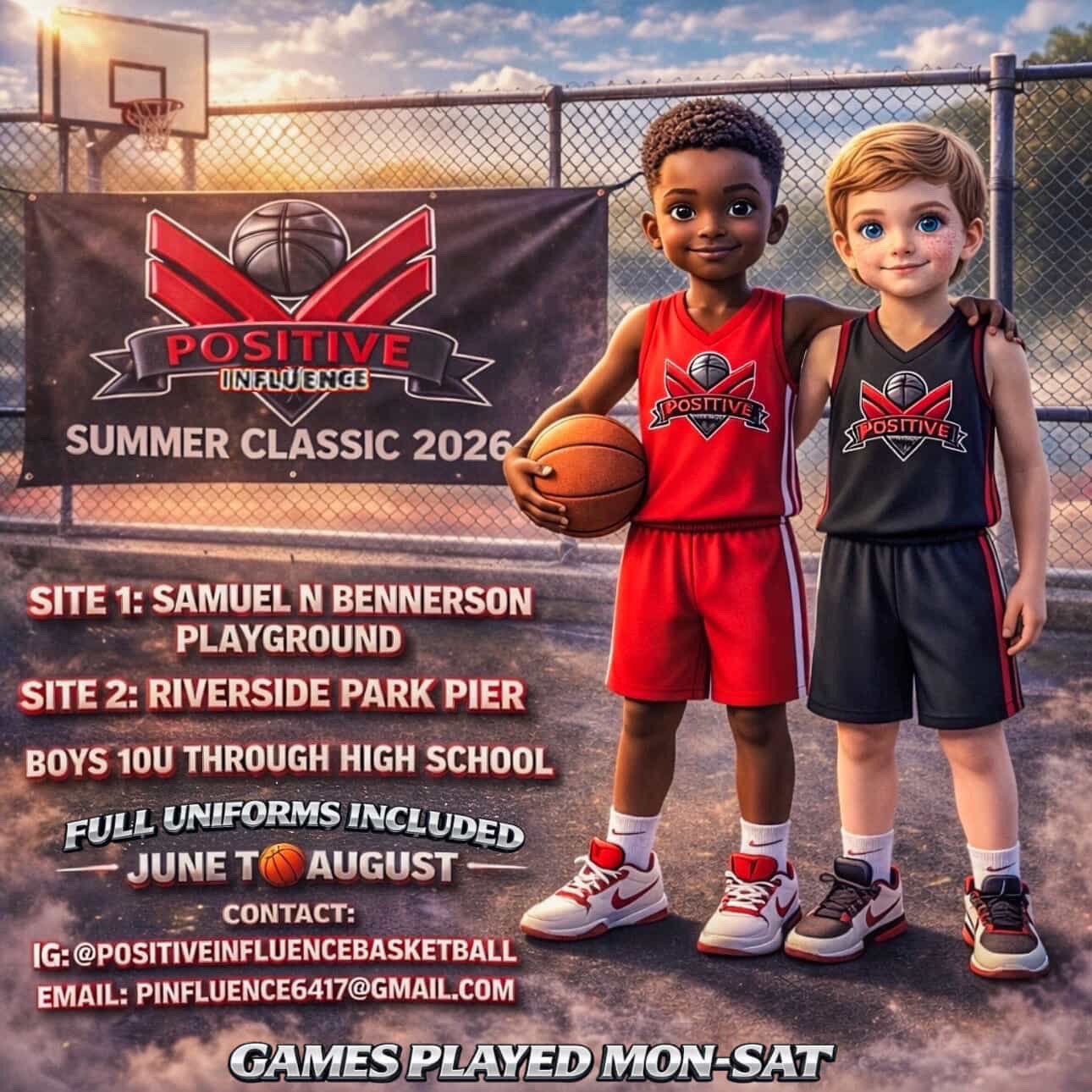 SUMMER BASKETBALL 2O26 Tuesday, June 23, 2026 4:00 PM 9:00 PM Google Calendar ICS Summer Basketball 2026 Flyer summer league 2026 Join Positive Influence Summer League 2026. This exciting summer basketball league offers a competitive and fun environment for boys and girls to showcase their skills and build lasting connections. Register Now